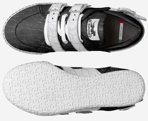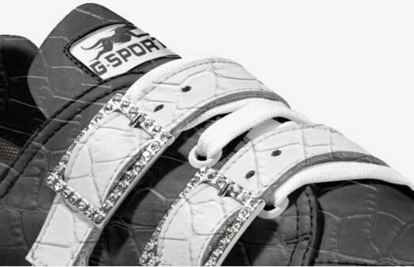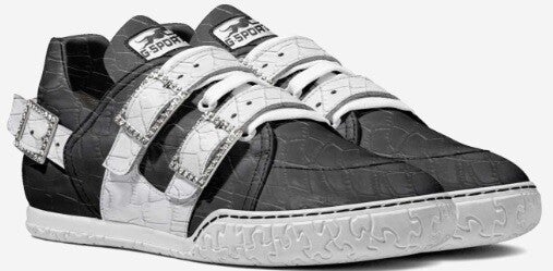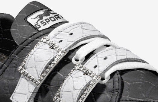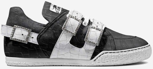 The “Urban Gator Luxe” sneaker blends high-end streetwear style with exotic elegance. Crafted with a textured faux gator upper in bold black and white contrast, this shoe features three oversized rhinestone-encrusted buckles for a flashy but refined finish. The sculpted sole and signature GSPORT cheetah logo brand makes this a standout piece for trendsetters who command attention. Ideal for upscale urban fashion with a fearless edge.