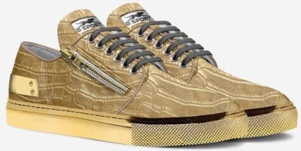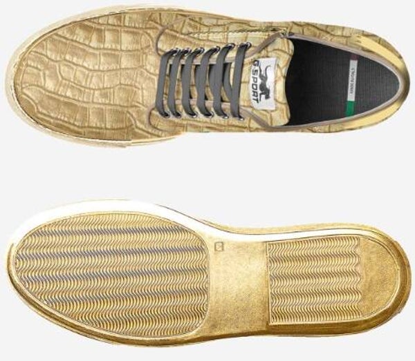 Gator-Gold Armored Sneaker is a luxurious low-top sneaker showcases a metallic gold gator embossed leather upper accented by a polished gold zipper and matching logo plate at the heel. A striking mirrored gold cup sole with black welt stitching adds bold contrast and contemporary flair. It delivers premium comfort with a padded heel collar and cushioned insole—perfect for making a high-impact. Adorned with the signature G-SPORT cheetah logo patch add upscale flair.
